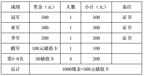 十三、奖励办法(赛事奖金1000现金+300储值卡)