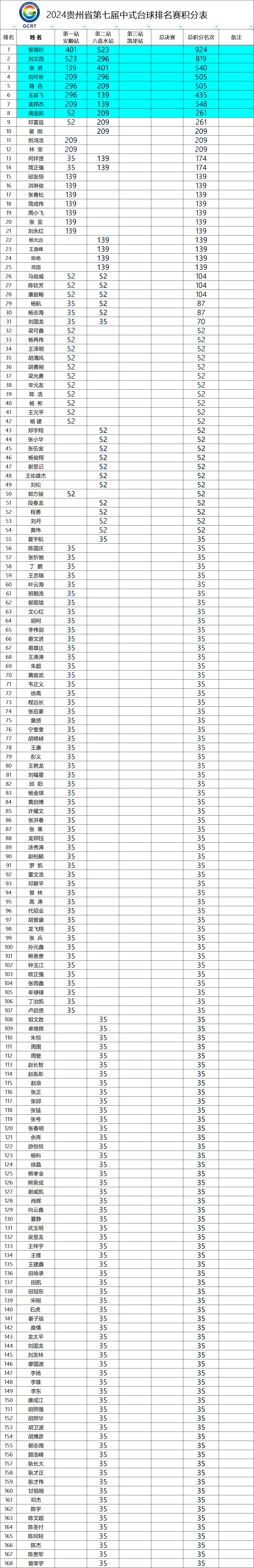贵州省中式台球排名赛最新积分前8的选手以排名决定种子选手顺序,其余混抽入位。